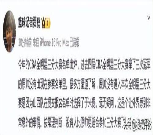 原帥無緣CBA全明星三分大賽!媒體人:山西主動報名于米提頂替