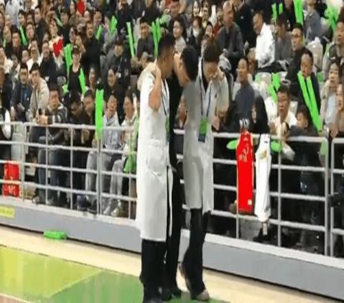現(xiàn)場醫(yī)務(wù)人員立即上場,34號裁判李津被兩位人員給攙扶離場,去接受檢查與治療。