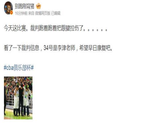 根據(jù)媒體人別跑剛背豬報道:“今天這比賽。裁判跑著跑著把跟腱拉傷了……看了一下裁判信息,34號是李津老師,希望早日康復(fù)吧!”