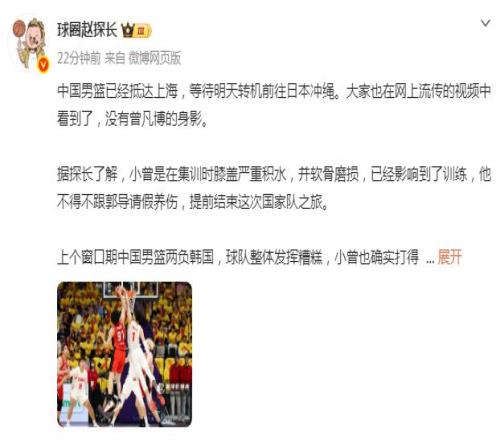 根據(jù)媒體人球圈趙探長報道:“曾凡博是在集訓(xùn)時,膝蓋嚴重積水,并軟骨磨損,已經(jīng)影響到訓(xùn)練,他不得不跟郭士強指導(dǎo)請假養(yǎng)傷,提前結(jié)束這次國家隊之旅。”