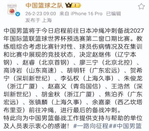 就在中國(guó)男籃抵達(dá)上海轉(zhuǎn)機(jī)的時(shí)候,中國(guó)男籃官方正式公布了14人名單,其中高詩(shī)巖留隊(duì),第一階段表現(xiàn)出色的龐崢麟落選,另外包括曾凡博、徐昕、徐杰等人也因?yàn)閭‰x隊(duì),根據(jù)計(jì)劃,中國(guó)男籃會(huì)在比賽前確定12人名單。
