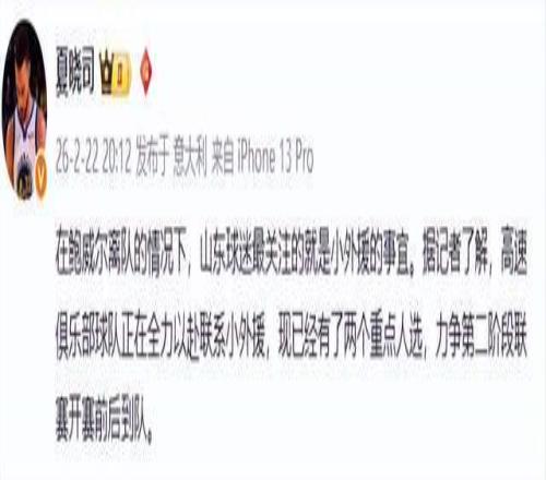 至于小外援?根據(jù)山東媒體人夏曉司的報(bào)道,山東男籃俱樂部已鎖定兩名重點(diǎn)目標(biāo),正全力推進(jìn)簽約,目標(biāo)明確:第二階段開賽前,必須到位。