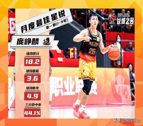 在常規(guī)賽10-23輪的比賽中,龐崢麟出戰(zhàn)14場。在他場均出場的32分鐘里,能夠得到15分、2.8籃板、5.8助攻的數(shù)據(jù),罰籃命中率82.3%。龐崢麟在本月度4次得到20+的單場得分,其中包含一場26分、8籃板、13助攻的“準三雙”數(shù)據(jù)。