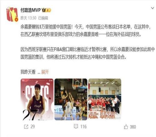 根據(jù)媒體人付政浩的消息,西班牙聯(lián)賽只有在FIBA窗口期比賽臨近的時候才會暫停比賽,所以留給余嘉豪的時間非常短,當?shù)貢r間昨天晚上他還在打比賽,今天連續(xù)周轉(zhuǎn)5次航班累計飛行超過1.4萬公里才能抵達沖繩,這種精神值得所有男籃球員們學習。昨天客場的比賽是在西班牙位于非洲的飛地梅利利亞打的,比賽結(jié)束后余嘉豪先從梅利利亞飛往馬加拉,然后再飛回巴塞羅那,從巴塞羅那飛往北京,再從北京飛往東京,最后一程是東京飛往沖繩。