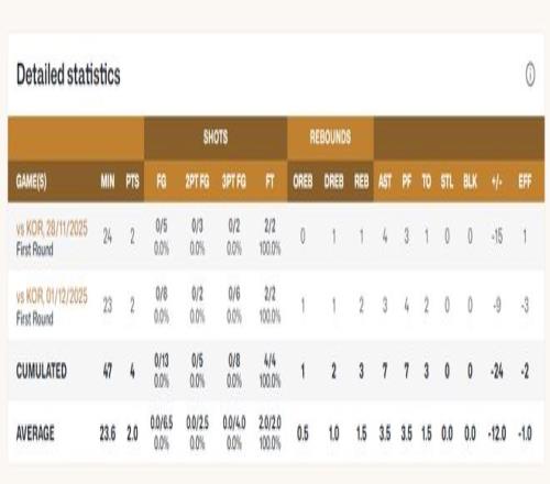 第二場(chǎng)23分鐘,8中3,三分6中0,罰球2中2,拿到2分3助攻1籃板2失誤,合計(jì)13中0,三分8中4,在場(chǎng)-24,胡明軒作為男籃前隊(duì)長(zhǎng)表現(xiàn)非常之差。
