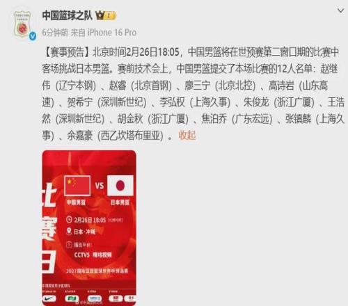 中國(guó)男籃公布對(duì)陣日本男籃的12人大名單,如下: