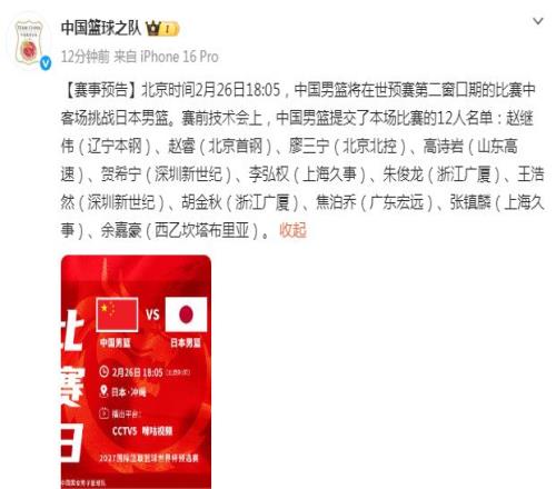 中國(guó)男籃將在2月26日18點(diǎn)05,在客場(chǎng)挑戰(zhàn)日本男籃。