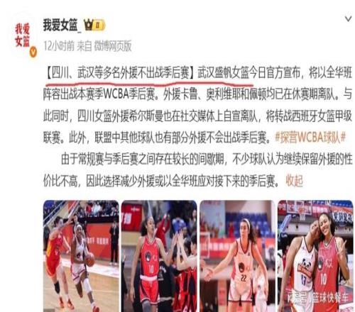 中國女籃的天塌了,根據(jù)知情人士透露,WCBA女籃季后賽恐怕將面臨一大尷尬境地,由于常規(guī)賽與季后賽相間時間太長,不少外援已經(jīng)選擇不在繼續(xù)為WCBA聯(lián)賽效力了,轉(zhuǎn)而加盟其他海外聯(lián)賽了。武漢女籃已經(jīng)正式宣布,他們將以全華班出戰(zhàn)季后賽,而爭冠大熱門球隊四川隊,他們也放棄了外援希爾斯曼。從這一點上來看,今年的WCBA季后賽,恐怕更無亮點可言了。