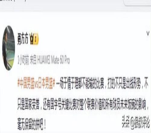 賽前,北京記者勇方方發(fā)文點評:“中國男籃vs日本男籃,一場于情于理都不能輸?shù)谋荣悾虻牟恢皇浅鼍€形勢,不只是國家榮譽,還有國字號關(guān)鍵比賽對整個聯(lián)賽價值和所有球員未來飯碗的影響,毫無保留的拼吧! ”
