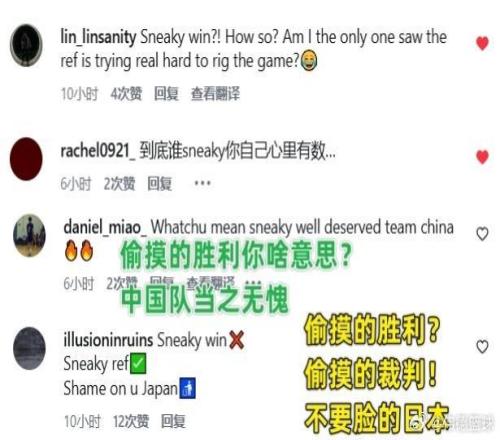 大批中國(guó)球迷涌入了評(píng)論區(qū),給FIBA世界籃聯(lián)留言怒懟:“到底誰偷偷摸摸你自己心里有數(shù)?!?、“偷摸的勝利你什么意思?中國(guó)隊(duì)當(dāng)之無愧。”、“不是偷摸的勝利,而是偷摸的裁判?!?,“偷摸的勝利?偷摸的裁判!不要臉的日本!”