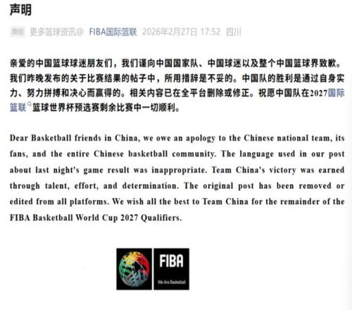 在輿論壓力持續(xù)升溫后,2月27日,國際籃聯(lián)通過其中文微信公眾號發(fā)布正式致歉聲明。