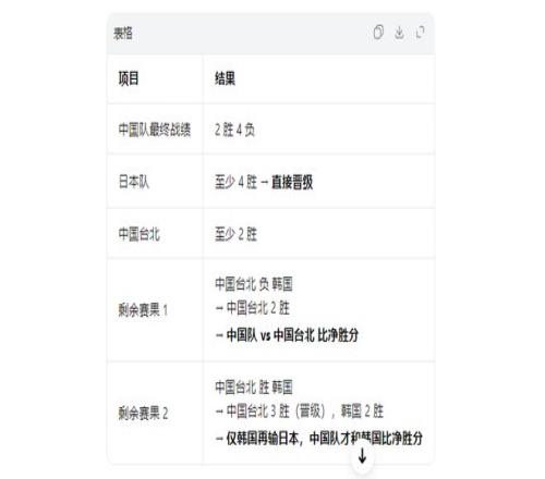 若余下一場中國臺北贏韓國,他們最終可3勝晉級;韓國戰(zhàn)績來到2勝3負(fù),中國隊需指望韓國再輸給日本,再與韓國比凈勝分爭晉級名額