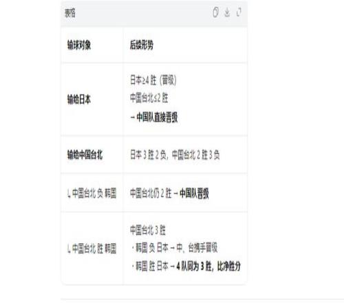 若輸?shù)倪@場是中國臺北,日本隊成績來到3勝2負(fù),中國臺北隊2勝3負(fù)。余下一輪,若中國臺北隊輸韓國,他們?nèi)?勝,中國隊晉級;贏韓國,他們成績也會來到3勝3負(fù)。