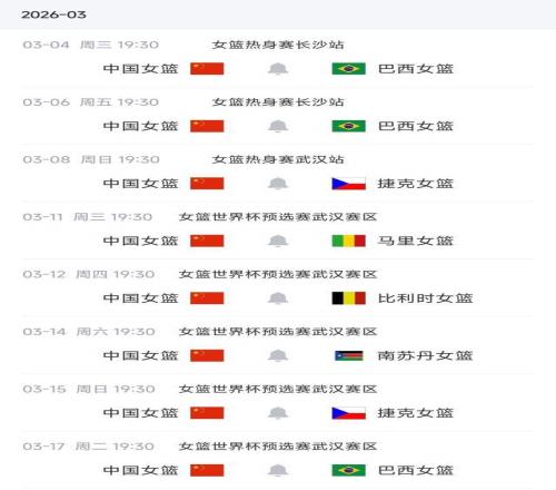 中國(guó)女籃的賽事安排是:3月4日、6日在湖南長(zhǎng)沙和巴西女籃打兩場(chǎng)熱身賽。隨后3月8日來(lái)到湖北武漢,和捷克女籃打一場(chǎng)熱身賽。(這兩個(gè)對(duì)手,也是接下來(lái)世預(yù)賽的對(duì)手)——3月11日開始,中國(guó)女籃就將正式開啟世界杯預(yù)選賽之旅:同組對(duì)手不是特別強(qiáng),先戰(zhàn)馬里、比利時(shí)和南蘇丹。隨后再戰(zhàn)捷克和巴西。