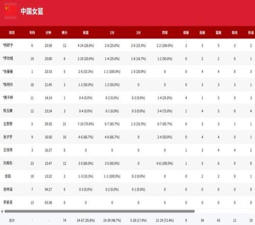 本賽季效力于武漢盛帆的王佳琦出場16分鐘,雖然傷病初愈沒有出手,但全隊最高的4次助攻外加4個籃板,依然展現(xiàn)出這位聯(lián)賽助攻王的價值。出自華中科技大學女籃、為湖北征戰(zhàn)全運會的陳玉婕得到了23分鐘的出場時間,有3分和5籃板入賬。兩位選手的主要精力都在防守和適應國家隊節(jié)奏上,不算出彩,但貴在踏實。