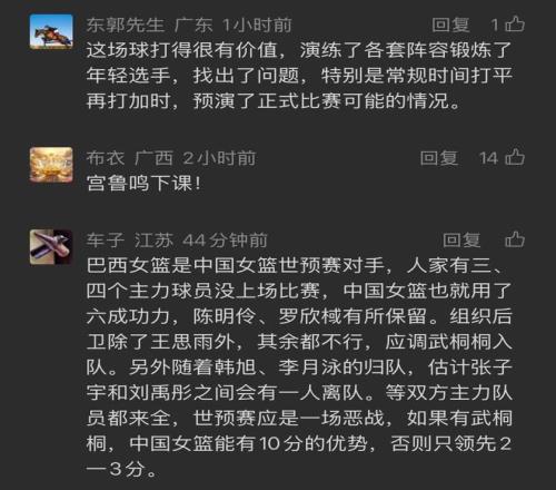 可筆者想說的是,其實我們真的錯怪宮魯鳴了。這場球本來就是練兵,因為第四節(jié)一直打不開局面時,主教練也沒有叫暫停,更沒有換上主力球員,目的就是讓年輕人得到成長。如果熱身賽都讓王思雨、楊舒予打滿全場,就算常規(guī)時間贏了這場比賽,又有什么鍛煉價值呢?即使這場比賽輸了,也沒有什么,其作用主要是讓我們看到新人的不足,讓她們得到鍛煉,這才是熱身賽的價值所在。
