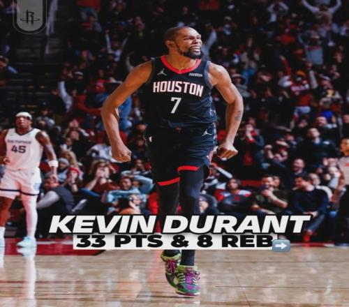 火箭老將凱文-杜蘭特發(fā)揮出色:首發(fā)出戰(zhàn)37分鐘,投籃24中11,三分9中4,罰球9中7,砍下33分8籃板2助攻1蓋帽2失誤。杜蘭特已經(jīng)連續(xù)三場比賽砍下30+:36分、32分和33分,成為NBA歷史第五個在37歲后做到這點(diǎn)的球員。