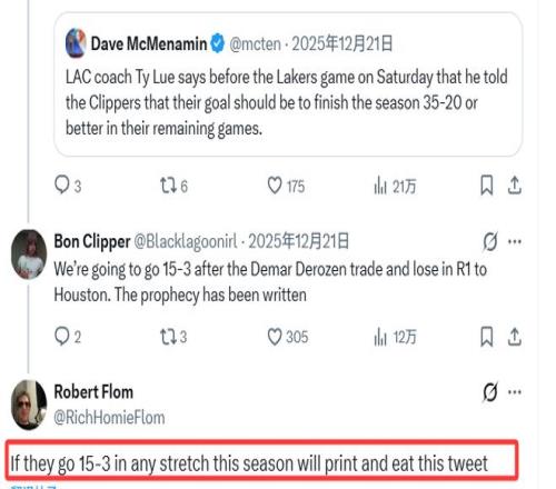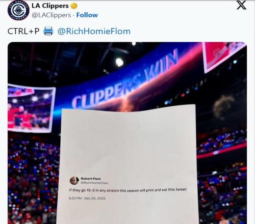 這件事的起因還要追溯到一個多月前,快船主帥泰倫-盧曾在12月21日表示,他向球隊提出了剩余賽程拿下35勝20負的目標。彼時,快船的戰(zhàn)績僅為6勝21負。弗洛姆當時在社媒上回應(yīng)盧的這一目標時寫道:“如果快船本賽季能打出一波15勝3負的戰(zhàn)績,我就把這條推文打印出來吃掉?!?/p>