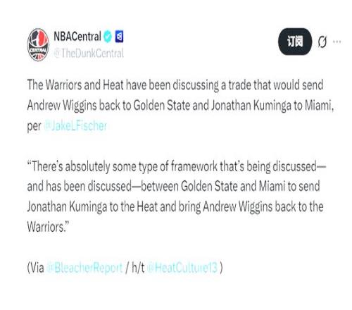 北京時(shí)間1月28日,NBA交易市場(chǎng)的流言焦點(diǎn)再度聚焦于金州勇士與邁阿密熱火身上。據(jù)名記Fischer最新報(bào)道,兩隊(duì)關(guān)于鋒線球員的交易談判已進(jìn)入實(shí)質(zhì)階段,一套以庫(kù)明加換維金斯為核心的3換1交易框架正在逐步成型。交易流言的發(fā)酵并非偶然。早在此前,名記Stein就曾披露勇士有意通過(guò)交易庫(kù)明加換回舊將安德魯·維金斯,如今這一設(shè)想已從探討走向?qū)嵅佟T缭?月16日庫(kù)明加主動(dòng)遞交的交易申請(qǐng),不過(guò)隨后巴特勒遭遇傷病,科爾不得不重新啟動(dòng)庫(kù)明加,盡管復(fù)出的兩場(chǎng)表現(xiàn)不俗,但是很快遭遇了傷病,而庫(kù)明加本人的離隊(duì)訴求始終未變,這無(wú)疑讓勇士管理層加快了交易談判的進(jìn)程。