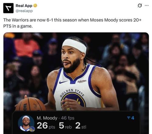 同時這是本賽季穆迪第7次拿到20+得分表現(xiàn),當(dāng)他拿下20+得分時,勇士交出6勝1負(fù)戰(zhàn)績。