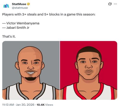 其中小賈巴里史密斯尤為明顯,全場(chǎng)小賈打出攻防俱佳表現(xiàn),12中5,三分6中2拿下14分8板3助3斷5帽全能表現(xiàn),正負(fù)值+15首發(fā)第一名,也讓其成為本賽季文班之后,第二位單場(chǎng)送出至少3斷5帽的球員。