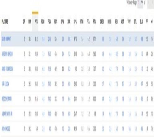 全場比賽杜蘭特34分鐘22秒(末節(jié)只打了5分鐘老鷹就投子認(rèn)負(fù)),22中12,三分8中3,罰球4中4,拿到31分5籃板4助攻,命中率54.5%,三分命中率37.5%,真實(shí)命中率65.2%,正負(fù)值+12。