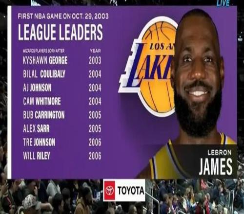 本場比賽,詹姆斯得到20分3板6助。據(jù)轉(zhuǎn)播方提供數(shù)據(jù)顯示,在奇才陣容中,有8名球員都在詹姆斯NBA生涯首秀后出生。
