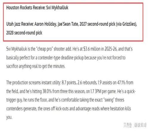 媒體FW結合各隊需求,就策劃火箭跟爵士進行交易,比如可以爭取神射手米哈伊柳克。在這筆交易方案中,火箭送出兩替補阿龍-霍樂迪跟杰肖恩-泰特,再加上次輪選秀簽,分別來自2027和28年,主要就是贏在當下,提升現階段投射穩(wěn)定性。