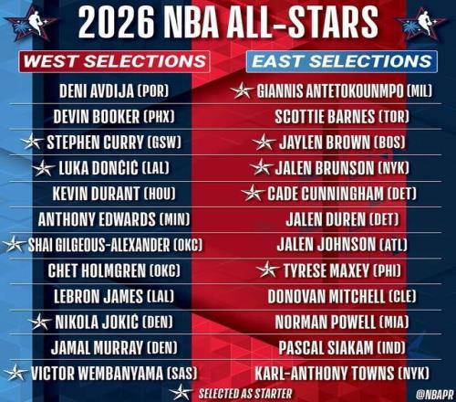 先來看看本次全明星的具體24人大名單,首發(fā)這邊西部:亞歷山大、東契奇、庫(kù)里、文班亞馬和約基奇,東部馬克西、字母哥、布倫森、康寧漢姆和杰倫·布朗。