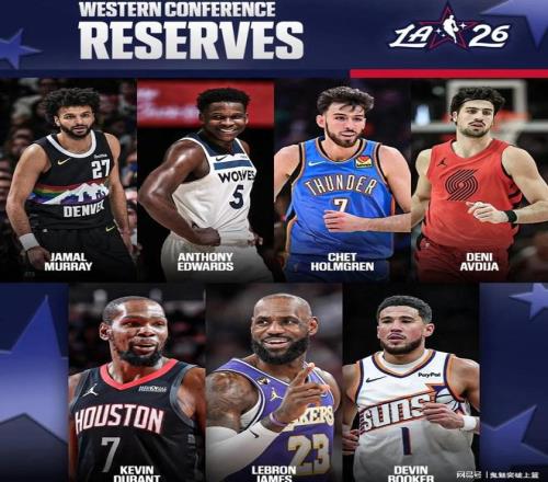 入選西部替補(bǔ)全明星的有:安東尼愛(ài)德華茲、切特霍姆格倫、賈馬爾穆雷、德文布克、德尼阿夫迪亞、凱文杜蘭特、勒布朗詹姆斯。