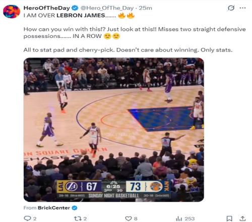 著名詹黑媒體賽后吐槽勒布朗的防守(正好就是湖人第三節(jié)崩盤的開始):我對(duì)勒布朗-詹姆斯已經(jīng)厭倦了,他這樣打球怎么可能贏?看看這個(gè)瞬間吧,連續(xù)兩個(gè)防守回合都漏人,他只顧著刷數(shù)據(jù)、挑有利數(shù)據(jù)的位置,他根本不在乎輸贏,只在乎數(shù)據(jù)。