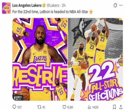 賽前NBA官方公布全明星替補名單,詹姆斯連續(xù)22年入選刷新自己保持的NBA歷史第一紀(jì)錄,湖人官方第一時間曬圖慶祝。