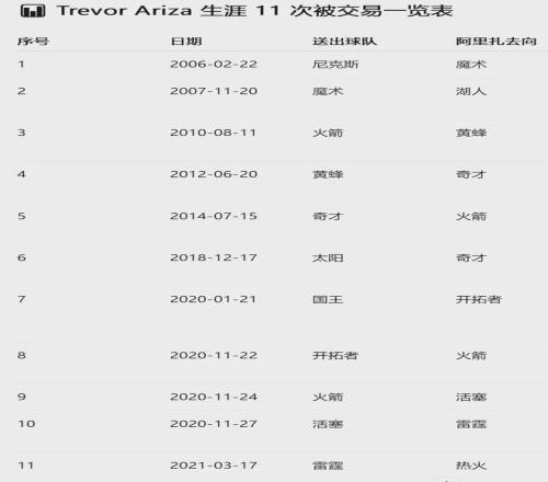 阿里扎至此已經(jīng)被交易了7次,接下來才是真正的顛沛流離:2020年11月17日,開拓者將阿里扎送回火箭;11月19日,火箭又把他送到活塞;11月21日,活塞將阿里扎送到雷霆。短短四天換了四隊!2021年3月18日,雷霆將其送到熱火。