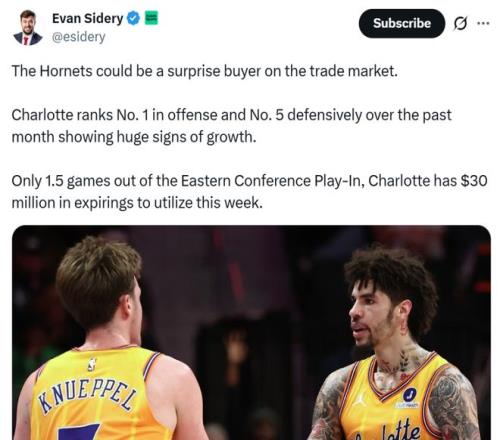 在豪取7連勝強勢北伐的同時,黃蜂隊還手握3000萬到期合同,美記Evan Sidery曝他們將成為交易截止日前的黑馬之一。