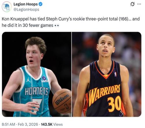 他僅花費50場比賽就已經(jīng)命中166記三分,而庫里新秀賽季出戰(zhàn)80場才達到這一數(shù)字,要知道黃蜂隊本賽季還有31場常規(guī)賽要打,克努佩爾勢必要大幅提升這一紀錄。