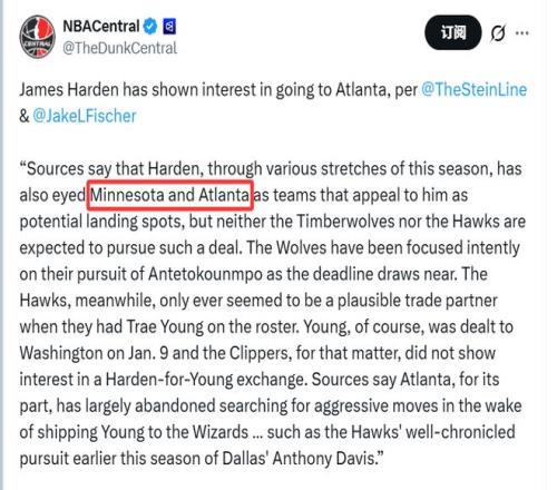 隨著交易截止日臨近,森林狼正全力專注于追逐字母哥。至于老鷹,只有在特雷-楊仍在陣中時(shí),才具備成為可行交易伙伴的可能性;而特雷-楊已于1月10日被交易至華盛頓奇才,快船方面也從未對哈登換特雷-楊的方案表現(xiàn)出興趣。消息源稱,在將楊送至奇才后,老鷹基本已放棄尋求重磅操作,這也包括本賽季初他們曾被廣泛報(bào)道的、追逐達(dá)拉斯獨(dú)行俠球員安東尼-戴維斯的相關(guān)計(jì)劃。