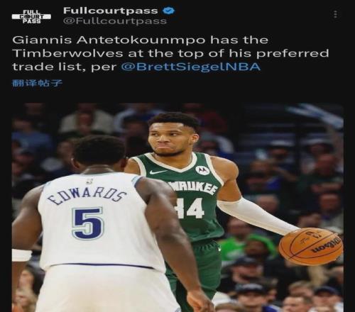 名記Siegel對此表示,字母哥把加盟森林狼&搭檔愛德華茲視為首選,有望今年交易截止日(2月6日)前就空降到明尼蘇達(dá)。