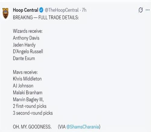 北京時間2月5日,奇才、獨行俠達成了大交易,獨行俠送出安東尼-戴維斯、杰登-哈迪、丹吉洛-拉塞爾、丹特-艾克薩姆;奇才送出克里斯-米德爾頓、AJ-約翰遜、馬拉基-布蘭納姆、馬文-巴格利三世、2個首輪簽、3個次輪簽。