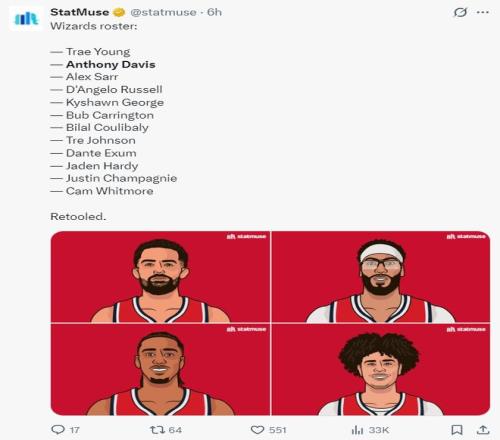 這筆交易后,根據(jù)ESPN的消息,本賽季被奇才交易得到的全明星球員特雷楊、安東尼-戴維斯都不會再這個賽季代表奇才隊出戰(zhàn),球隊內部志在輸?shù)舾啾荣悰_擊更高的順位,AD與特雷楊也可以利用今年來將傷病全部治愈。