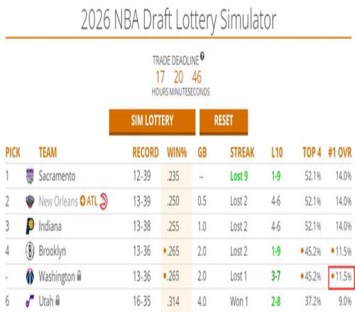 目前奇才13勝36負,狀元簽概率11.5%,前四順位概率45.2%,實際上奇才與國王、鵜鶘、步行者勝場只差2-1.5個,奇才隊說不定有希望繼續(xù)擺爛到最差,奇才隊可以沖擊一下狀元簽。