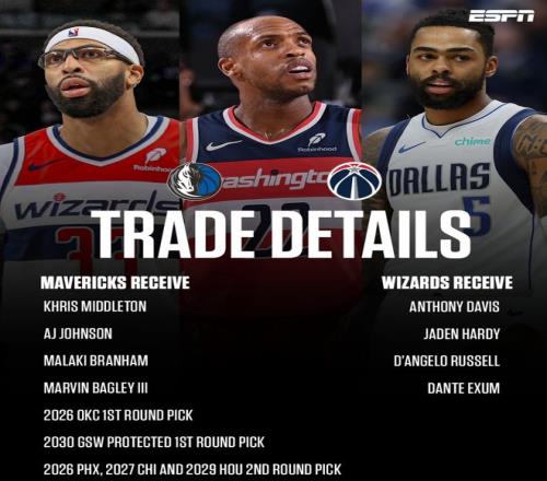 達拉斯獨行俠、華盛頓奇才達成了大交易,獨行俠送出濃眉、哈迪、拉塞爾、艾克薩姆從奇才換來米德爾頓、AJ-約翰遜、布蘭納姆、巴格利、2首輪、3次輪。