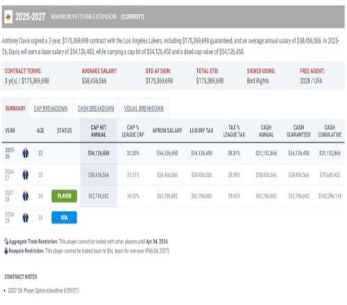 濃眉三年1.75億的合同正在執(zhí)行第一年,26-27賽季價值5845萬、27-28賽季價值6278萬(球員選項),濃眉在明年夏天就有資格談新的提前續(xù)約問題,獨行俠送走濃眉的一個關鍵因素就是他的續(xù)約問題。