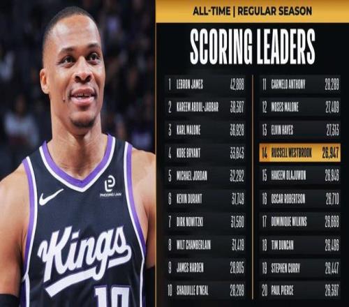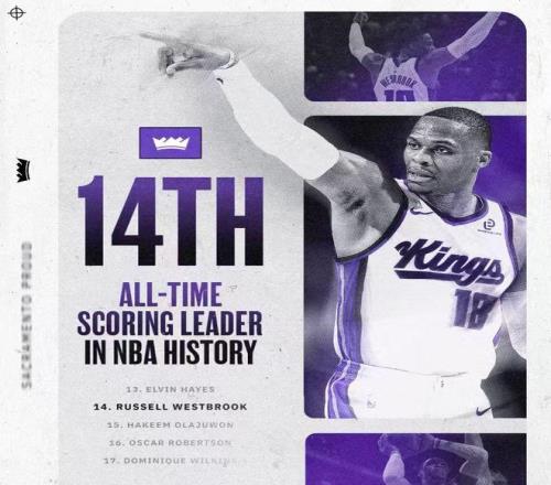 威少常規(guī)賽總得分超越火箭名宿奧拉朱旺,升至NBA歷史總得分榜第14位。