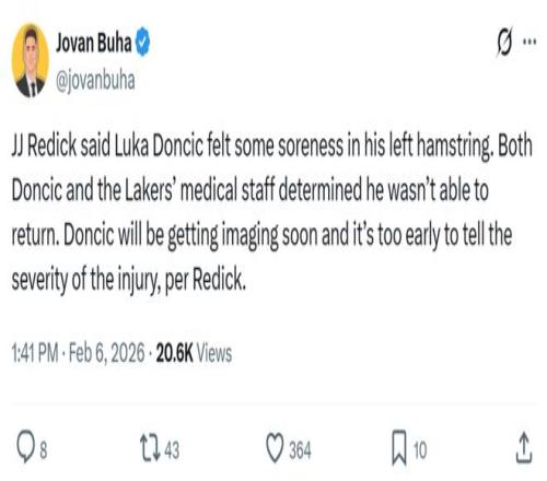 湖人官方也在半場(chǎng)結(jié)束時(shí)確認(rèn)消息真實(shí)性,指出東契奇因腿筋酸痛本場(chǎng)將不會(huì)回歸,確定缺席下半場(chǎng)的爭(zhēng)奪。