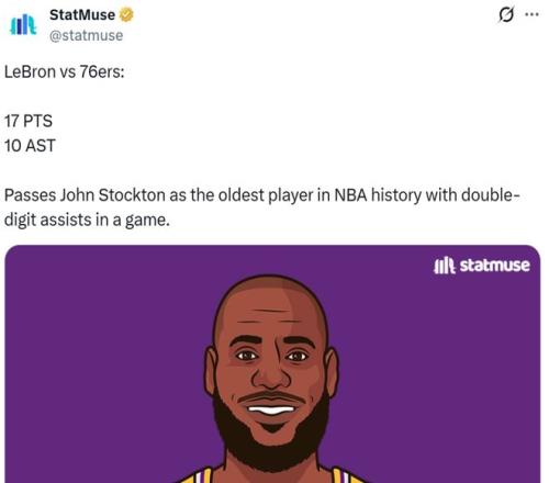 盡管狀態(tài)低迷,但41歲38天的詹姆斯還是超越斯托克頓(41歲19天),成為NBA歷史上單場(chǎng)助攻上雙最老球員。