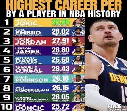 最近nba world wide coverage發(fā)布了“NBA歷史球員生涯最高球員效率值”榜單,約基奇排在第1,恩比德、喬丹緊隨其后,詹姆斯也進(jìn)了前四。榜單里既有奧尼爾、張伯倫這種長(zhǎng)期被反復(fù)對(duì)比的歷史中鋒,也有字母哥、東契奇這種還在上升期的現(xiàn)役球星。把不同時(shí)代、不同位置、不同比賽節(jié)奏下的球員放在同一張表里,光看一個(gè)“球員效率值”就把名次定死,約基奇壓過(guò)喬丹和詹姆斯排第1,這個(gè)位置到底算不算合理?