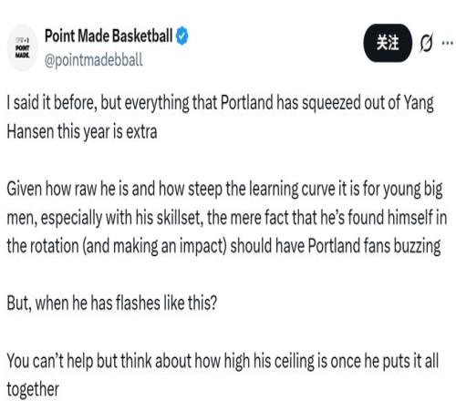 球迷Queens寫道:“楊瀚森正持續(xù)證明自己為何是當(dāng)下最值得關(guān)注的、風(fēng)格獨(dú)特的年輕內(nèi)線之一。”