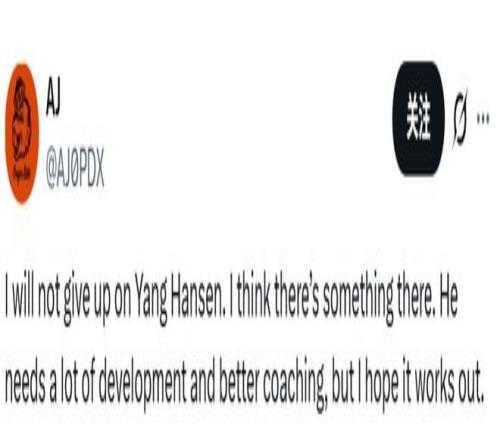 球迷AJ發(fā)文寫道:“我絕不會(huì)放棄對(duì)楊瀚森的期待。我相信他身上是有潛力的。他確實(shí)需要大量的打磨提升,也需要更優(yōu)質(zhì)的指導(dǎo),但我真心希望他能越來越好?!?/p>
