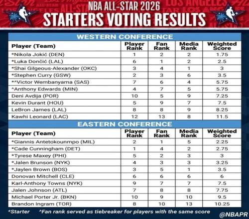 東契奇(斯洛文尼亞人)球迷投票高居第一,球員投票排名第六,媒體投票位列第二(權(quán)重為2.5)。