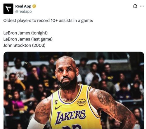 憑借這樣的表現(xiàn),41歲零40天的詹姆斯超越上一場的自己,成為NBA歷史上單場送出至少10次助攻最老的球員。